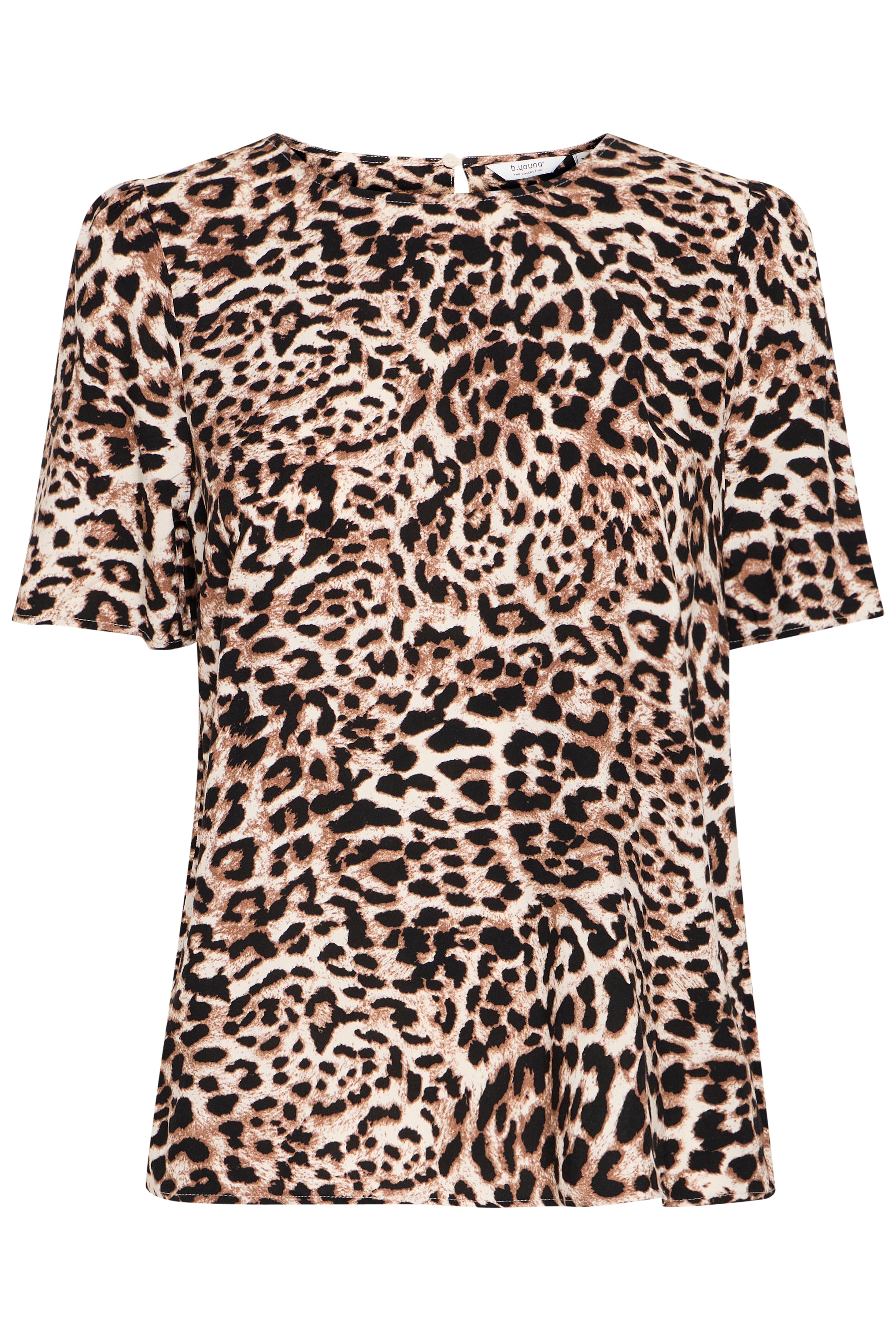 Bluse von b.young mit Rundhalsausschnitt. Kurze Ärmel. Schlitz mit Knopf im Nacken. Unten abgerundet. Gewebte Qualität. Die Bluse von b.young hat eine normale Passform.