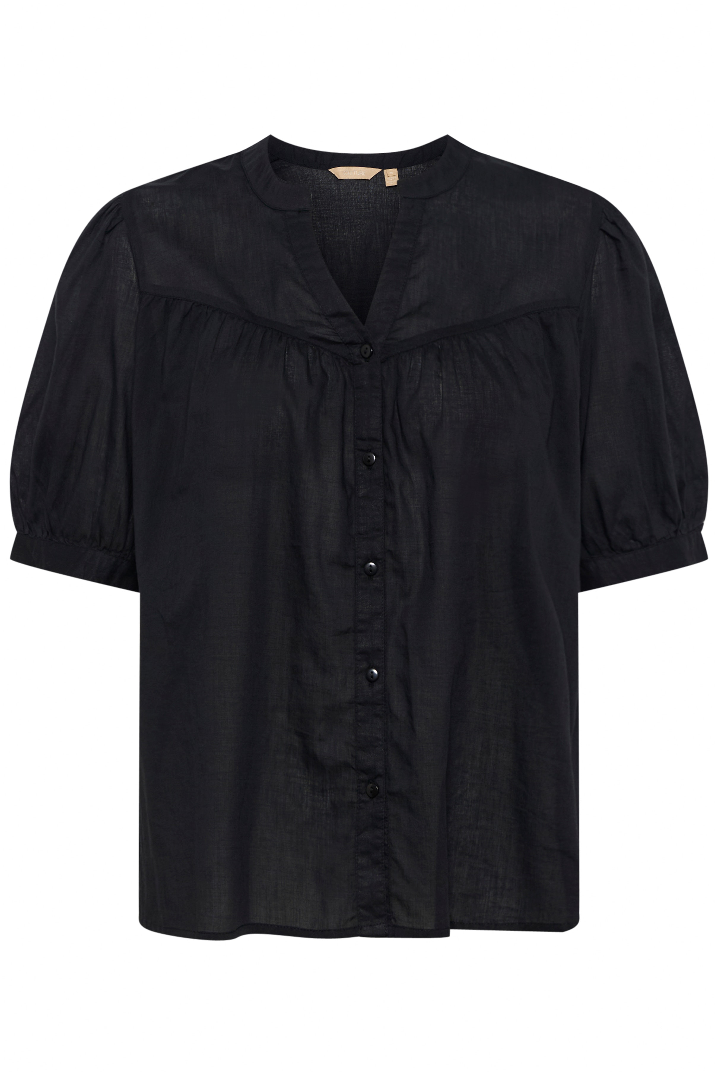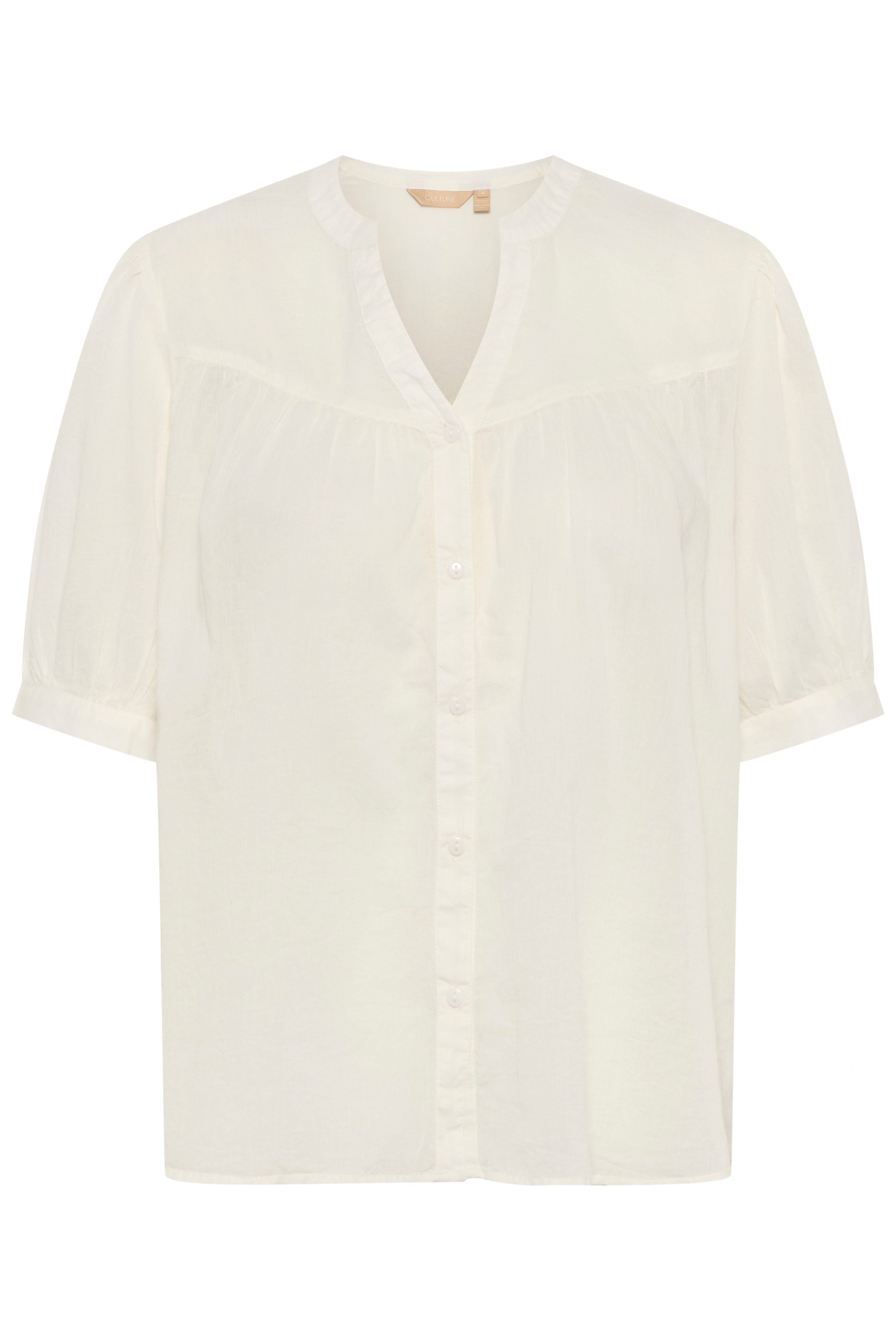 Locker geschnittene Bluse mit Knopfleiste und kurzen, gerafften Ärmeln. V-Ausschnitt mit kleinem Stehkragen, dezentes Schulter-Joke.