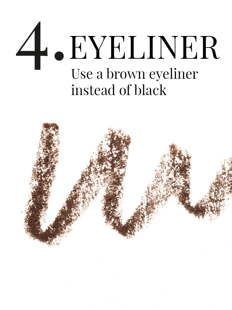 Define your eyes with eyeliner, but avoid using liquid formulas as they can be too harsh. Instead, opt for a soft pencil eyeliner and apply it only along the upper lash line – eyeliner under the eye can drag your eyes downward. Choose a dark brown shade for a softer, fresher look.