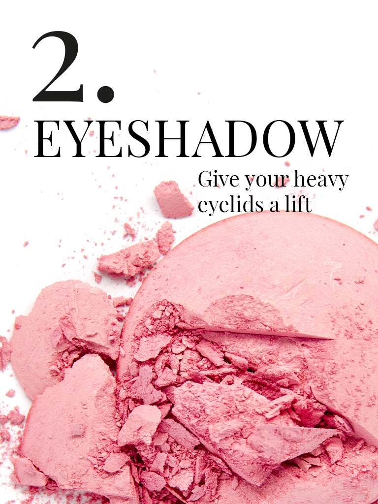 Apply a light eyeshadow just beneath the brow bone and in the inner corner of the eye. This lifts the eye and makes it look more open. Blend a darker shade into the crease and the outer corner of the eye to soften the appearance of heavy eyelids. Avoid applying eyeshadow solely on the lower part of the eyelid, as this can accentuate heavy eyelids.